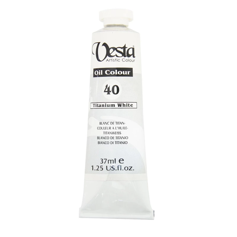 ⚪ Titanium White (سفید تیتانیوم): یک پیگمنت سفید خالص است. این رنگ کدرترین پیگمنت سفید محسوب میشود. سفید تیتانیوم بعنوان یک رنگ قوی و استاندارد، پرکاربردترین و محبوبترین رنگ سفید در میان هنرمندان است. این رنگ از پیگمنت دیاکسید تیتانیوم (Titanium Dioxide) ساخته میشود که نخستین بار در اوایل قرن بیستم معرفی شد. به دلیل قدرت پوشانندگی (Opacity) بسیار بالا و درخشندگی فوقالعاده آن سفید تیتانیوم انتخاب اول بسیاری از نقاشان است.